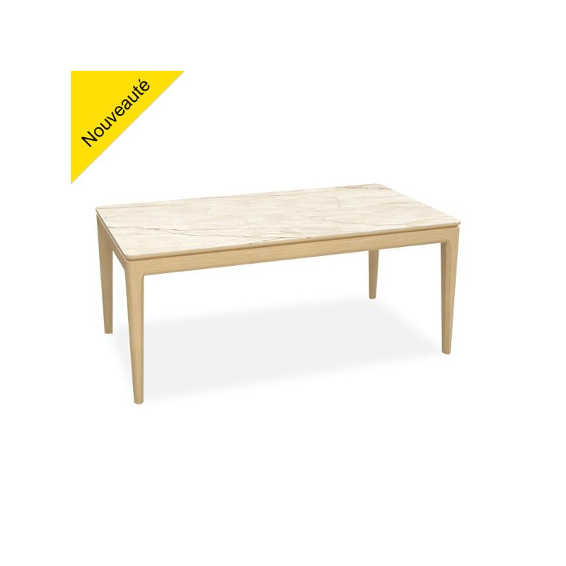 Tables de repas rectangle : Piètement : Tilleul massif plaqué chêne Traverses de ceinture : Panneaux de fibres moyenne densité revêtus de placage chêne - Structure intérieure : Tilleul massif. Plateaux et allonges : Panneaux de particules alaisés revêtus de céramique beige veiné. Table de salon : Plateau : Panneaux de particules revêtus de céramique beige veiné - Pieds : Charme massif plaqué chêne. Finition : Finition : teinte acrylique - vernis de finition acrylique