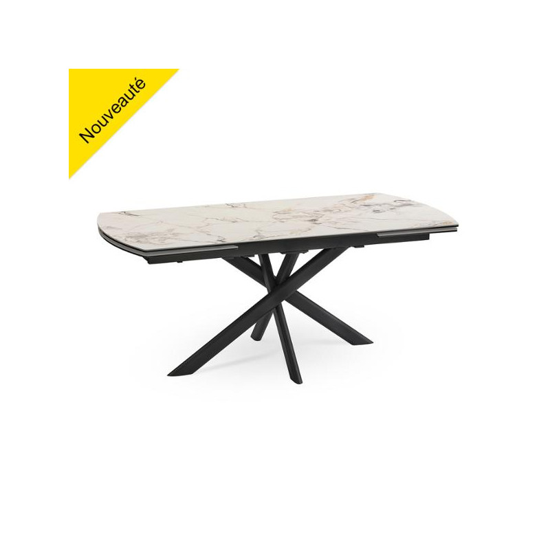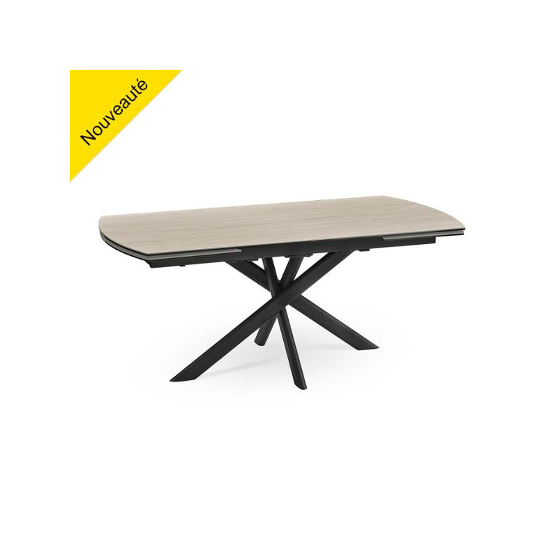 Table convexe en 180 x 90 - "Calypso" 2 allonges en bout escamotables de 45cm Plateau céramique + verre épaisseur totale 14mm Céramique 6mm collée sur un verre d'épaisseur 8mm Piètement fer finition époxy gris anthracite Pieds entremêlés ovale Longueur table ouverte avec 1 allonge : 2,25m Longueur table ouverte avec 2 allonges : 2,70m Long.: 180 - Larg.: 90 - H.: 76 - 122 Kgs
